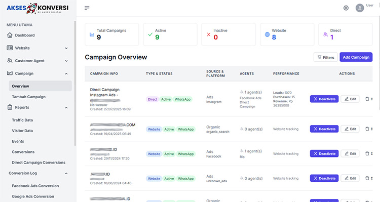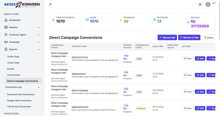 Sistem ini dirancang untuk memudahkan pemilik bisnis dan marketer membaca data konversi, menilai efektivitas kampanye, serta mengoptimalkan budget iklan dengan keputusan berbasis data. Didukung teknologi otomatisasi dan laporan real-time, Akses Konversi menjadi solusi efisien untuk menghubungkan traffic, leads, dan penjualan, memastikan setiap klik bernilai maksimal bagi pertumbuhan bisnis digital.